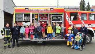 Um den Kindern die Angst vor den Geräuschen eines Atemschutzgerätes zu nehmen, wurde auch dieses angelegt und die Fluchthaube erklärt. Mit einem kleinen Strahlrohr mussten die Kinder Dosen umspritzen. Höhepunkt und krönender Abschluss war die Rückfahrt mit dem Feuerwehrauto zurück zum Kindergarten.