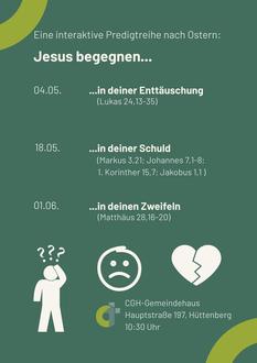 | 10:30 Uhr | Gottesdienst, Markus Fromhold, mit interaktiver Predigt, Teil 2, siehe Flyer |