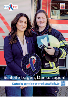 Zeigen Sie sich solidarisch mit unseren Einsatzkräften, tragen sie die “Schutzschleife“. Sie ist ein Symbol der Verbundenheit und der Wertschätzung. In den Farben Blau, Rot und Weiß gehalten, steht sie für die Polizei-, Feuerwehr- und Rettungskräfte in Hessen. Sie erhalten die Schutzschleife kostenlos unter: schutzschleife@hmdis.hessen.de