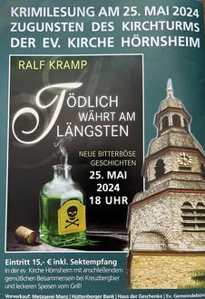 Krimilesung mit Sektempfang mit Eifel-Krimi-Autor Ralf Kramp zugunsten des Kirchturms der Kirche Hörnsheim „Tödlich währt am längsten. Neue bitterböse Geschichten.“ Anschließend gemütliches Beisammensein bei Kreuzbergbier und leckeren Speisen vom Grill. Kartenvorverkauf: Metzgerei Manz, Hüttenberger Bank, Haus der Geschenke, Pfarramt.