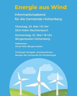 Wir laden alle interessierten Bürgerinnen und Bürger herzlich ein zum Infoabend „Windenergie“ mit Bürgermeister Oliver Hölz und Christoph Schöpfer, ehrenamtlicher Energieberater.