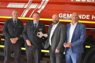 Die symbolische Schlüsselübergabe von Manfred Adam an Bürgermeister Hölz im Beisein von Benedikt Kummer, Gemeindebrandinspektor, (links) und dem Hessischen Innenminister Roman Poseck (rechts)