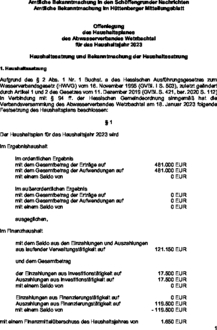 | Die vorstehende Haushaltssatzung für das Haushaltsjahr 2023 wird hiermit öffentlich bekannt gemacht. |