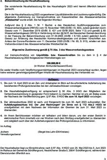 | 2. | Die Haushaltsbegleitverfügung ist entsprechend § 50 Abs. 3 HGO den Mitgliedern der Verbandsversammlung in geeigneter Form bekannt zu machen; hierüber ist uns ein Beleg sowie der Nachweis der Veröffentlichung gem. § 97 Abs. 5 HGO bis zum 14. April 2023 vorzulegen. |