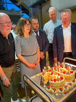 Philippe Cartier, Monika Wadakur, Sébastien Geoffray, Dr. Manfred Schmidt und Bürgermeister Christof Heller mit der Geburtstagstorte