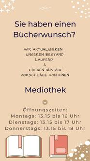 Sie können Ihre Bücherwünsche gerne im Rathaus oder in der Mediothek abgeben oder formlos per Email an info@huettenberg.de senden.