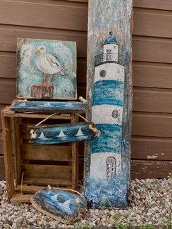 Den Leuchtturm malen wir unter fachlicher Anleitung auf einem ca. 22 x 80 cm großen Holzuntergrund in Spachtel- und Acrylmaltechnik. Dabei lassen wir unserer Kreativität freien Lauf und bringen unsere eigenen Gestaltungsideen ein. Das fertige Kunstwerk ist ein Glanzpunkt im Rahmen eines maritimen Arrangements und/oder bringt die Sommerdeko vor der Hausttür so richtig zur Geltung.