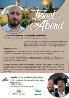 Wir laden ein zu einem ISRAEL-ABEND „Corimli Benjamin - Ich heiße Benjamin“. Am 21. Juni, 19:00 Uhr kommt Benjamin Funk. Hören Sie auf authentische Berichte des Lebens als Deutscher in Israel. Wir hören Humorvolles, Spannendes und Nachdenkliches!