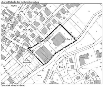 | (2) | Der räumliche Geltungsbereich liegt südlich der Wiesenstraße. Die Abgrenzung des Geltungsbereiches ist der beiliegenden Übersichtskarte zu entnehmen und beinhaltet in der Flur 2 die Flurstücke 155tlw., 156/1, 156/2, 157, 158 und 189, jeweils Gemarkung Hochelheim (Hüttenberg). |