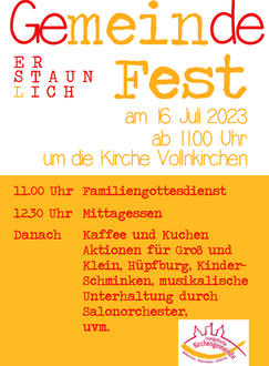 Am kommenden Sonntag, dem 16. Juli feiern wir Gemeindefest in Vollnkirchen. Wir beginnen mit einem Familiengottesdienst mit Pfr. Grubert um 11.00 Uhr in der Kirche Vollnkirchen und laden herzlich dazu ein.