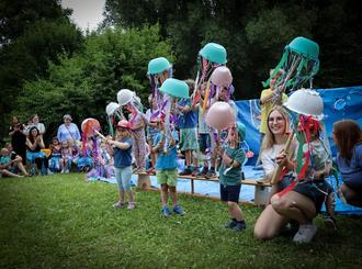 Und dann ging es richtig los „unter dem Meer“: die Gruppen zeigten nacheinander, was sie in den letzten beiden Wochen einstudiert hatten: Es gab glitzernde Meerjungfrauen, bunte Quallen und lustige Haie. Jede Gruppe hat zu toller Musik getanzt und unsere Krippenkinder führten eine Choreografie mit Tüchern vor.
