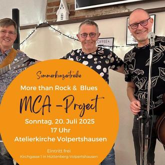 MCA Project spielen "More than Rock 'n Blues". Mathias Rau, Claus Bühler und Achim Schwarz-Tuchscherer bringen mit Stimme, zwei Gitarren, Percussion, Harp und viel Spielfreude bekannte, weniger gehörte und eigene Songs auf die Bühne im Ateliergarten.