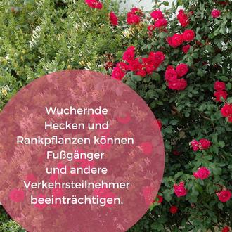 Daher wird an dieser Stelle an alle Grundstückseigentümer appelliert, über der Freude an der schönen Grundstückseinfassung nicht zu vergessen, dass über dem Gehweg eine lichte Höhe von mindestens 2,50 m (bis auf die Grenze zurückschneiden) und über Straßen von mindestens 4,50 m eingehalten werden muss. Unabhängig von der Verkehrssicherungspflicht des Grundstückseigentümers, gebietet schon die gehörige Rücksichtnahme auf die Bedürfnisse von Kindern, Behinderten und älteren Menschen gerade während der Vegetationszeit den Grundstücksbewuchs an der Grenze öfter zu kontrollieren und ggf. zurückzuschneiden.