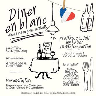 Der deutsch-französische Partnerschaftsverein Freundeskreis Crémieu lädt in Zusammenarbeit mit der Gemeinde Hüttenberg für Freitag, 25. Juli ein zu einem besonderen Abendessen in netter Gesellschaft. Das Diner en blanc hat in Frankreich eine lange Tradition: Die Tafel, die Bekleidung, die Gäste: alles ist komplett in Weiß gehalten: Es geht dabei um entspanntes Zusammenkommen, um das Entdecken ansprechender Treffpunkte und um das Teilen von Speisen, Perspektiven und Kulturen.