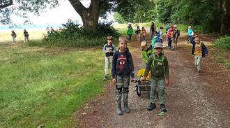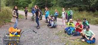 Auf dem folgenden Wegabschnitt sollten besonders schöne oder auffällige Blätter gesammelt werden, die von der Jury bewertet wurden. Die besten acht Kinder eines jeden Wettkampfes durften sich über eine süße Überraschung freuen. Anschließend ging es darum, zwei Stöcke zu finden, die beim Aneinanderschlagen einen möglichst lauten Knall erzeugen. Die Kinder wussten zunächst nicht, wozu man diese Klangstöcke noch verwenden kann. Nach einer kurzen Gruselgeschichte war es allen klar. Die Geschwister in der Geschichte konnten sich durch das Schlagen des S.O.S.-Signals mit ebensolchen Stöcken aus einer gefährlichen Lage retten. Den kompletten Morse-Code gab es zum Mitnehmen und Üben mit Stöcken oder Taschenlampen zu Hause. Nach einer kleinen Stärkung durften die Kids, die bis dahin noch nicht erfolgreich waren, ihr Können im „Dinge-Memory“ unter Beweis stellen. So waren am Ende alle Gewinner und der Rückweg wurde angetreten.