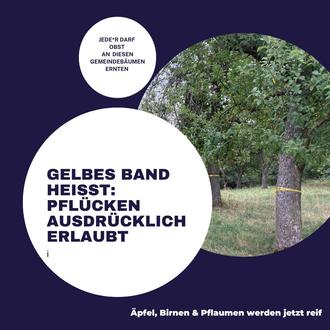 Die ersten Apfelbäume in den Gemarkungen Fernwald und Wolfsgräben sind bereits markiert. In den folgenden Wochen kommen noch viele weitere hinzu. Rainer Bechthold, Mitarbeiter in der Gemeindeverwaltung, kennzeichnet alle Obstbäume auf Gemeindeflächen, die nicht durch Patenschaften vergeben sind, mit einem gelben Band. An diesen Bäumen dürfen die Bürgerinnen und Bürger sich bedienen und Äpfel, Birnen, Pflaumen ernten. Die Ernteversteigerungen entfallen somit ab diesem Herbst.