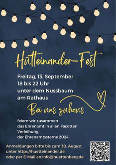 Anmeldungen sind ab sofort bis zum 30. August möglich über unser Veranstaltungsportal https://huetteinander.de. Unter dem Menüpunkt KURSANGEBOTE findet ihr das Hütteinander-Fest. Noch einfacher und direkter geht es über den QR-Code.