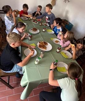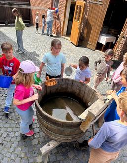 16 Ferienpasskinder haben bei Gottfrieds im Hof mit großer Begeisterung die Wäsche wie früher gewaschen. Auch die Besichtigung des Hauses hat sie sehr interessiert. In der Pause, während die Wäsche trocknete, gab es schon traditionell für alle Kinder und Helfer „Arme Ritter“. Zum Abschluss der Veranstaltung erhielt jedes Kinde einen Eisgutschein.