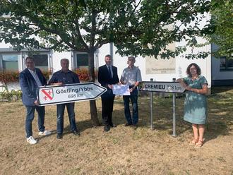 Hier geht´s nach Göstling und nach Crémieu: (von links) Frank Steinraths (stellvertretender Kreisvorsitzender), Udo Watz, Staatssekretär Uwe Becker, Rudi Weber und Monika Wadakur vor dem Rathaus in Rechtenbach