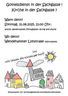 | 11:00 Uhr | Gottesdienst im Wendehammer/Lohstraße in Hörnsheim |