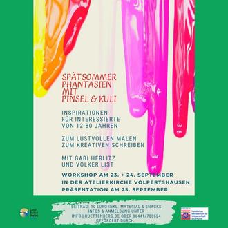 Die Workshopzeiten sind am Freitag von 15-18 Uhr und am Samstag von 10 -18 Uhr, Mittagspause und Nachmittagspause nach Absprache. Die Präsentation der Ergebnisse findet am Sonntag, 25. September ab 14 Uhr statt.