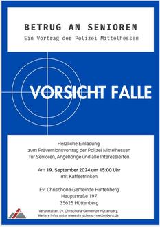 | 15:00 Uhr | „Vorsicht Falle - Betrug an Senioren“ |