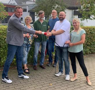 Von links: Volker Klös von der Sonneninitiative e.V. schließt symbolisch den energiefreundlichen Stromkreis mit den Investoren Astrid Conrad, Wolfgang Buff und Matthias Schlücking, Bürgermeister Oliver Hölz sowie Nadja Franz, die im Facility Management der Gemeindeverwaltung für die Koordination verantwortlich zeichnet.