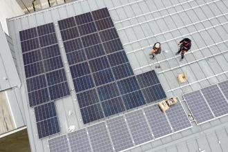 Installationsarbeiten im Frühjahr 2025 auf dem Dach des Rathauses