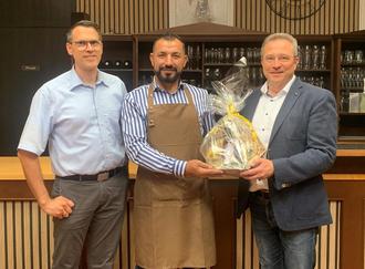Die Hüttenberger Bürgerstuben haben einen neuen Pächter: Bürgermeister Christof Heller und Finanzleiter Patrick Gronych überreichten dem Inhaber des Hüttenberger Traditionslokals, Abdurrarazzak Damar, ein Willkommensgeschenk und wünschten ihm viel Erfolg und vor allem viele zufriedene Stammgäste.