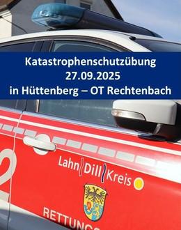 Am Samstag, den 27.09.2025 findet in Hüttenberg OT Rechtenbach eine große Katastrophenschutzübung des Lahn-Dill-Kreises statt. Die Übung dient der Aus- und Fortbildung von Einsatzkräften aller Hilfsorganisationen. Geübt wird der gesamte Ablauf einer Großschadenslage mit rund 300 Einsatzkräften. Am Nachmittag kann es zu Verkehrs- und Lärmbelästigung durch eine große Anzahl von Einsatzfahrzeugen kommen.
