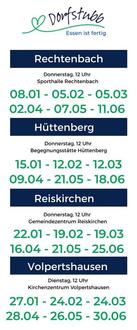 Auf diesem Flyer finden Sie alle Dorfstubb-Termine im ersten Halbjahr 2026 - für alle Ortsteile und mit den zuständigen Ansprechpartnern.
