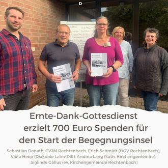 Zur Spendenübergabe kamen die Aktiven rund um den Ernte-Dank-Gottesdienst zusammen: Sebastian Donath (CVJM Rechtenbach), Erich Schmidt (OGV Rechtenbach), Siglinde Gallus (ev. Kirchengemeinde Rechtenbach), Andrea Lang (kath. Kirchengemeinde Hüttenberg - St. Anna). Die Freiwillige Feuerwehr Rechtenbach hatte das Zelt zur Verfügung gestellt und beim Aufbau geholfen.