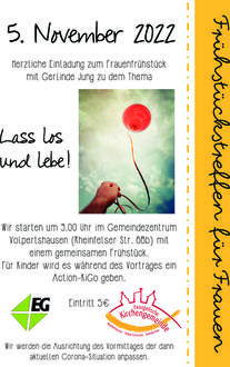 Herzliche Einladung zum Frauenfrühstück mit Gerlinde Jung zum Thema: „Lass los und lebe!“ am Samstag, dem 05.11. Wir starten um 9.00 Uhr im Gemeindezentrum Volpertshausen mit einem gemeinsamen Frühstück. Für Kinder wird es während des Vortrages von Frau Jung einen Action-Kigo geben. Der Eintritt beträgt 5 €. Wir freuen uns auf Ihr Kommen!