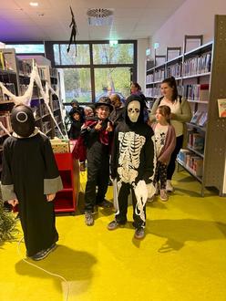 In der Mediothek fand am 31. Oktober spätnachmittags eine besondere Lesung für Kinder im Grundschulalter statt: „Mortina - Ein Mädchen voller Überraschungen“ von Barbara Cantini wurde als Bilderbuchkino gezeigt. Dabei ging es um ein kleines Zombie-Mädchen, das leider nie Freunde haben durfte, weil ihre Tante Angst vor einer möglichen Entdeckung hatte. Aber an Halloween konnte sie sich wie alle anderen Kinder auf der Straße zeigen, denn wenn diese verkleidet waren, sahen sie aus wie Mortina.