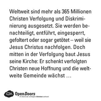 Weltweit sind mehr als 365 Millionen Christen Verfolgung und Diskriminierung ausgesetzt. Sie werden benachteiligt, entführt, eingesperrt, gefoltert oder sogar getötet - weil sie Jesus Christus nachfolgen. Doch mitten in der Verfolgung baut Jesus seine Kirche: Er schenkt verfolgten Christen neue Hoffnung und die weltweite Gemeinde wächst...