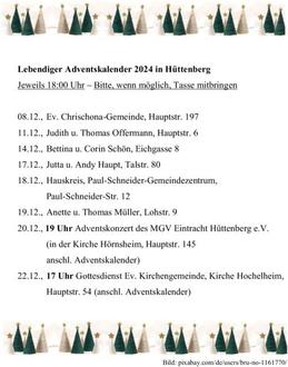 Eine schöne Gelegenheit, Ruhe in die Vorweihnachtszeit zu bringen, ist der Lebendige Adventskalender, der von den evangelischen Gemeinden in der Kerngemeinde Hüttenberg gestaltet wird.
