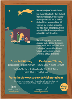 Wer noch unterwegs ist und warum alles ganz anders kommt als erwartet, davon erzählt dieses Musical mit neuen Liedern und Szenen, vielen Kindern, Solisten, Sprechern und Liveband.