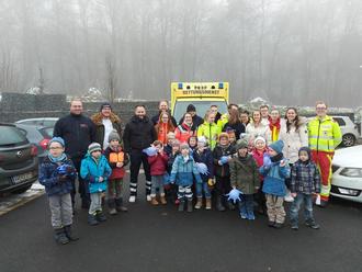 Wir wollen euch diesmal gerne von unserem Ausflug zur Rettungsschule erzählen. Es war so ein erlebnisreicher und spannender Vormittag. An dieser besonderen Schule werden Auzubildende von allen Trägern der Rettungshilfe unterrichtet. Die Klassen und ihre Ausbilder hatten sich den ganzen Vormittag nur für uns Zeit genommen. Nachdem wir in der Halle, wo die Unfälle nachgespielt und behandelt werden, gefrühstückt hatten, ging es in der Schule los. Wir wurden in vier Gruppen aufgeteilt und jedes Kind hatte zwei Azubis an seiner Seite. Wir lernten Verbände anlegen, wie unser Herz schlägt und warum es das tut. Dann mussten wir noch gegenseitig unseren Herzschlag messen und den Puls fühlen.