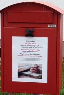 Wir möchten für Dich beten! Hast Du Kummer, Sorgen, Probleme, Ängste oder Dinge, die Dich belasten. Wirf uns gerne Dein Gebetsanliegen in unseren Gebetsbriefkasten ein. (anonym oder mit deinem Namen)