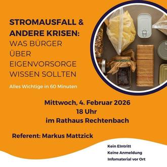 Die Veranstaltung erklärt verständlich den Unterschied zwischen einem lokalen Stromausfall und einem großflächigen Blackout, zeigt typische Folgen für Versorgung, Kommunikation und Alltag auf und ordnet ein, welche Verantwortung Staat und Gemeinde haben - und wo die Eigenverantwortung der Bürger beginnt.