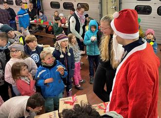 Nach einer Stunde Marsch kamen die knapp 100 Kinder inklusive ihren Betreuern ein wenig erschöpft und hungrig am Gerätehaus in Rechtenbach an. Dort warteten schon heiße Hot Dogs und Getränke auf sie. Nachdem sich alle wieder gestärkt haben, bekamen sie Besuch vom Weihnachtsmann mit einer seiner Engelchen, welche natürlich nicht mit leeren Händen kamen. Doch bevor Geschenke verteilt wurden, sangen die Kinder alle zusammen „Oh Tannenbaum“ und sagten für den Weihnachtsmann Gedichte auf. Dieser war damit so zufrieden, dass jede Gruppe ein Paket gefüllt mit Geschenken für Klein und Groß bekam.