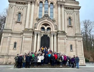 Nach einem kleinen Fußmarsch, vorbei am Staatstheater, startete unser Stadterlebnis am Marktplatz: Mit kleinen Bimmelbähnchen erkundeten wir die schönsten Ecken Wiesbadens. Die Fahrt führte uns vorbei an prächtigen Villen und historischen Gebäuden, die die besondere Eleganz der Stadt eindrucksvoll widerspiegeln. Ein Höhepunkt war der Besuch der russisch-orthodoxen Kirche Richtung Neroberg. Dieses prachtvolle Bauwerk bot den perfekten Ort für unser Gruppenfoto.