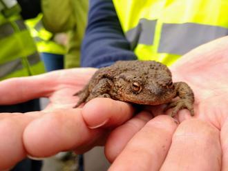 Die erste Erdkröte, die gerettet werden konnte, wird von den helfenden Kindern bestaunt