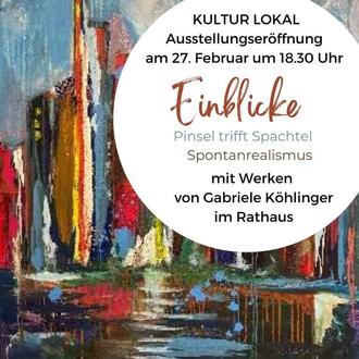 Im Rahmen unserer Reihe Kultur lokal präsentieren wir Ihnen die Ausstellung "EINBLICKE" mit Werken von Gabriele Köhlinger aus den Workshops „Pinsel trifft Spachtel“ und „Spontanrealismus“.
