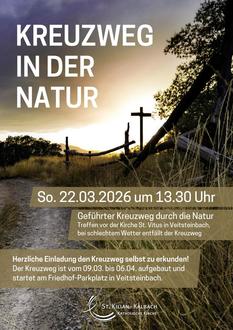 Wir laden Sie ein am Sonntag, 22. März 2026, 13.30 Uhr, im Anschluss an das Fastenessen, vor dem Bürgerhaus den Kreuzweg gemeinsam im Gebet zu begehen. Die Stationstafeln bleiben, bis Ostern stehen, somit besteht für jeden die weitere Möglichkeit den Kreuzweg auf seine ganz persönliche Weise und zu beliebiger Zeit beten zu können.
