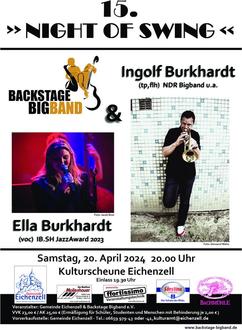 Anlässlich der 15. Night of Swing und somit eines kleinen Jubiläums hat sich die Backstage Big Band gleich zwei hochkarätige Gaststars eingeladen: den Jazz-Trompeter Ingolf Burkhardt und die junge Jazz-Sängerin Ella Burkhardt (Vater und Tochter).