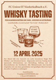 Der Abend hält eine Auswahl von sechs besonderen Single Malt Whisky`s aus Schottland bereit. Abgerundet wird das Tasting durch spannende Informationen zur Herstellung, Reifung und den Besonderheiten der Destillerien. Alle Whiskyfreunde sind herzlich eingeladen mit uns einen gemütlichen und geselligen Abend im Geist des edlen Tropfens zu verbringen!
