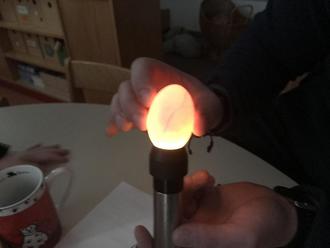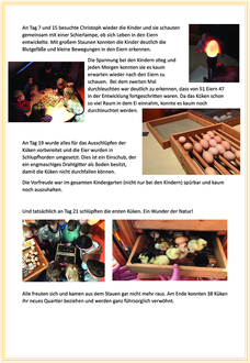 An Tag 7 und 15 besuchte Christoph wieder die Kinder und sie schauten gemeinsam mit einer Schierlampe, ob sich Leben in den Eiern entwickelte. Mit großem Staunen konnten die Kinder deutlich die Blutgefäße und kleine Bewegungen in den Eiern erkennen.