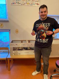 Was für eine tolle Aktion! Die Erzieherinnen und Kinder bedanken sich herzlich bei Christoph Becker und seinen Helferinnen. Christoph hat sich mit viel Liebe und Zeit um dieses Projekt gekümmert. Als kleine Erinnerung bekommt er von den Kindern ein T-Shirt überreicht.