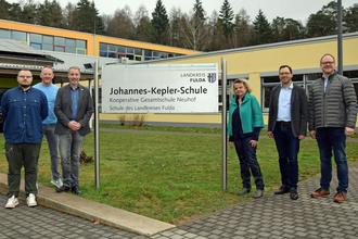 Schulleitung, Bürgermeister und Politiklehrer vor der Johannes-Kepler-Schule